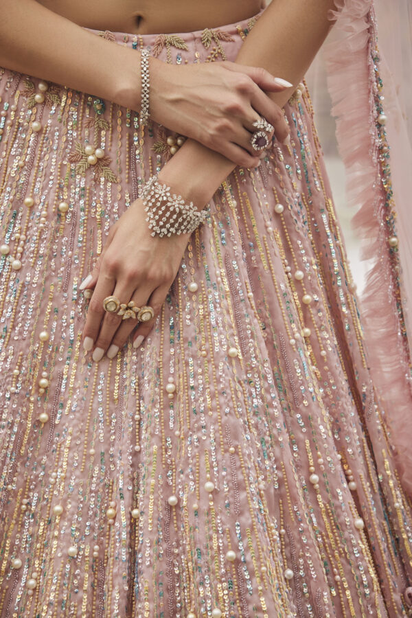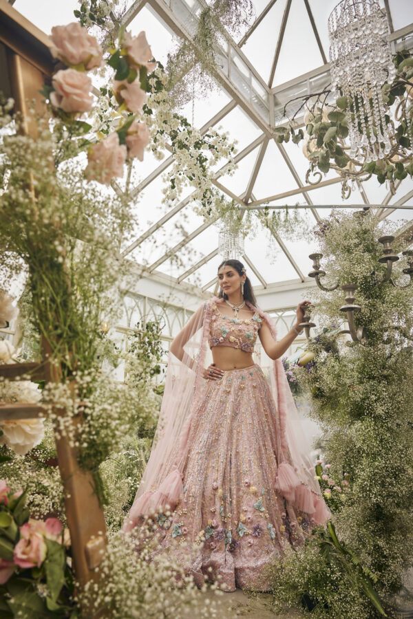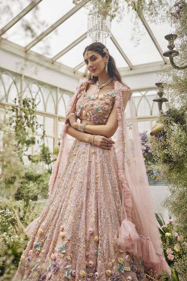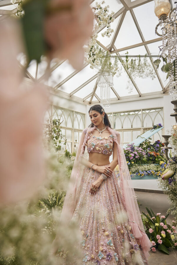 This lehenga is a dreamy couture piece that radiates fairytale elegance. Crafted in a soft pastel pink hue, the ensemble is lavishly adorned with shimmering sequins and delicate beadwork that catch the light with every movement. The voluminous skirt cascades gracefully, embellished with intricate 3D floral appliqués in pastel shades of lilac, aqua, and butter yellow, adding depth and a garden-like charm. The blouse mirrors the artistry with matching floral detailing and a flattering cropped silhouette, complemented by a flowing dupatta edged with delicate embellishments. Ethereal and enchanting, the lehenga evokes the magic of a blossoming spring garden brought to life in couture form.