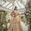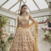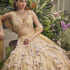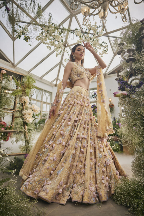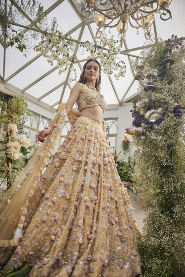 This lehenga is a true labour of love, crafted with exceptional detail and artistry. Set on a soft pastel yellow base, it’s adorned with intricate 3D floral embroidery—each petal carefully hand-sewn and brought to life with tiny pearl drops that cascade like water, adding a soft, flowing charm to the entire piece.