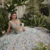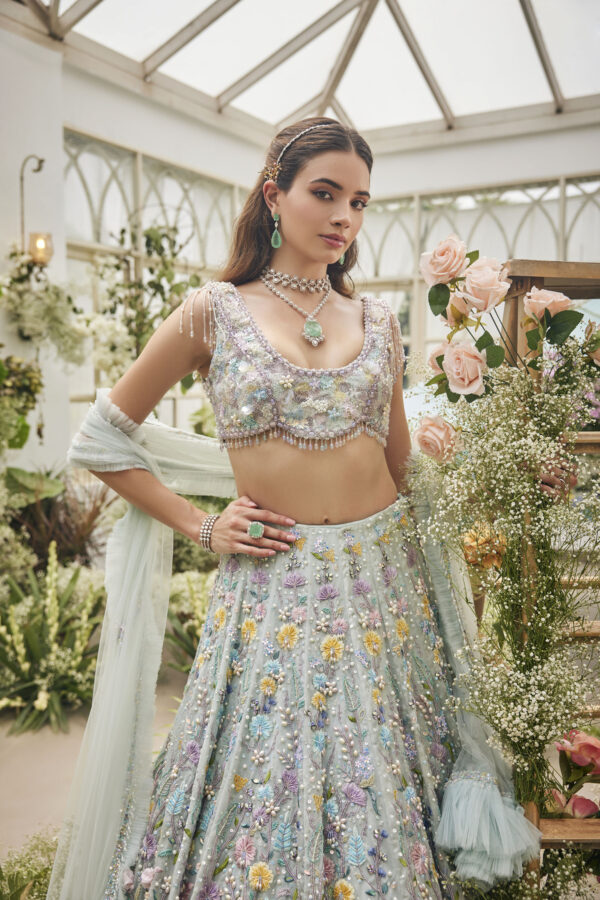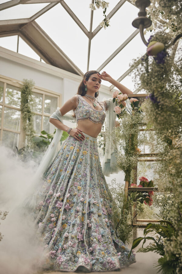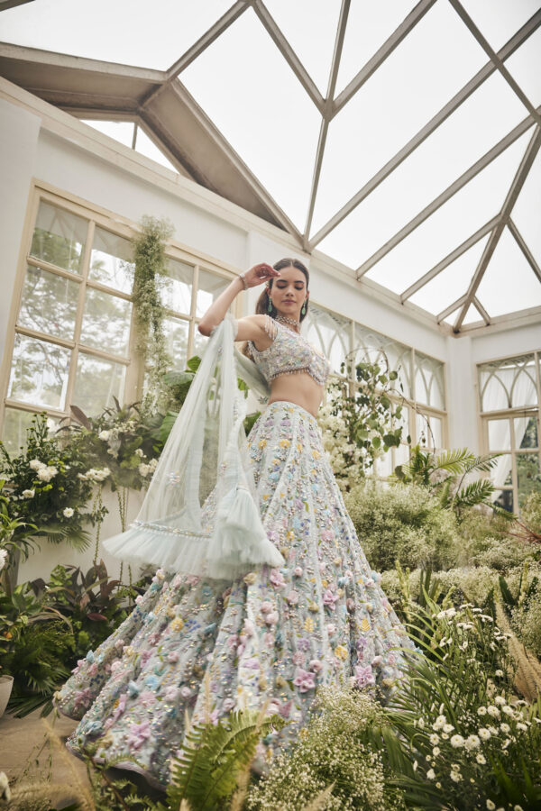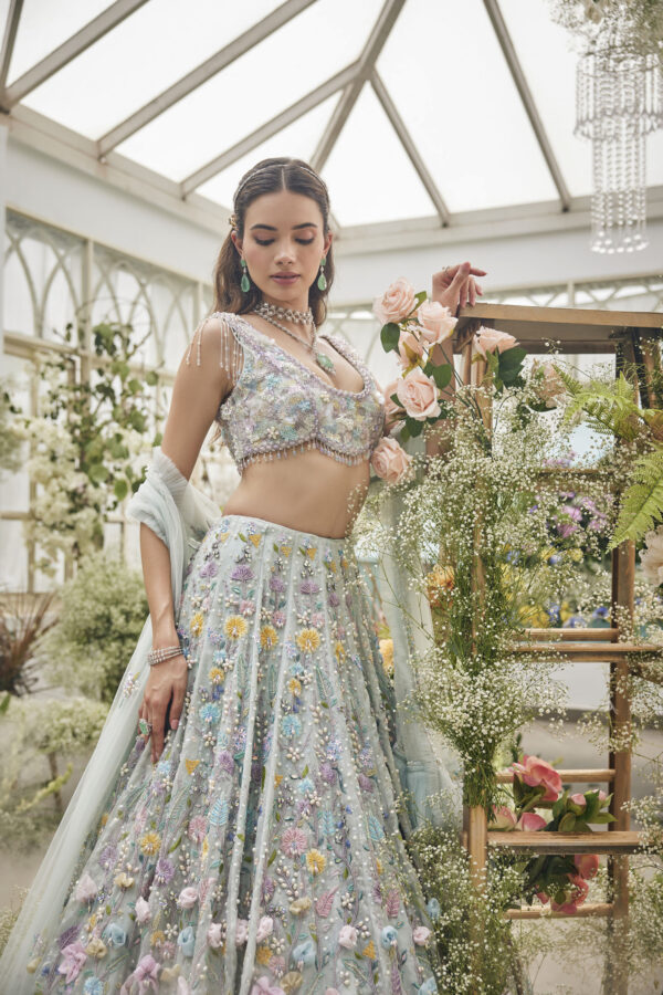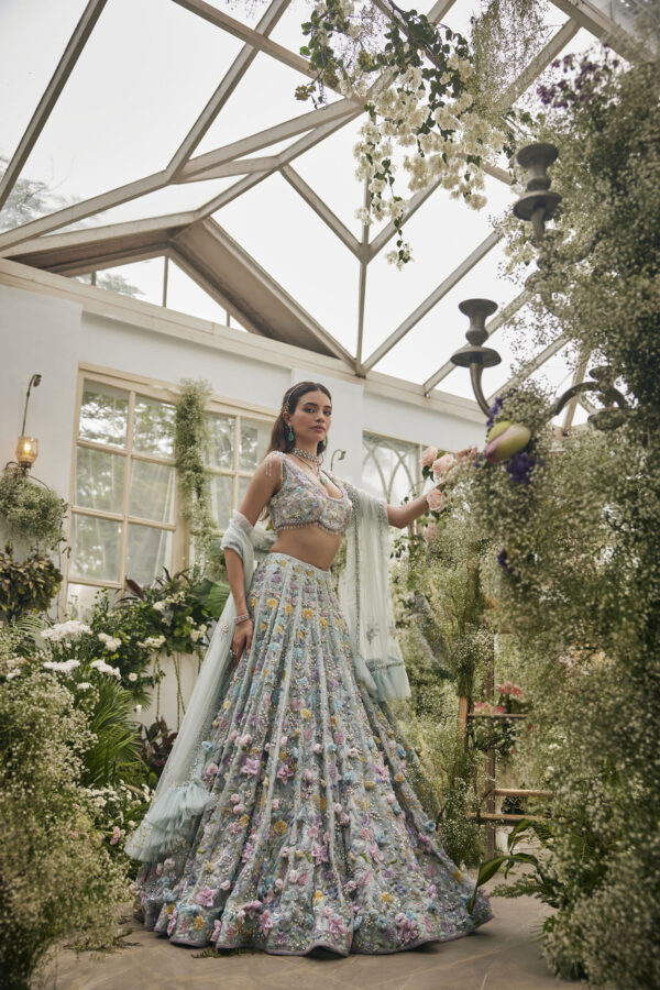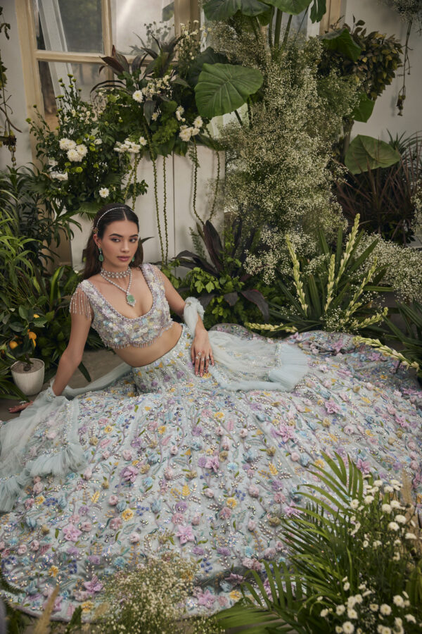 A symphony of soft pastels and meticulous craftsmanship, this lehenga is a true celebration of nature and couture. Adorned with intricately hand-embroidered 3D florals in shades of lavender, blush, butter yellow, and sky blue, each flower is brought to life with pearl droplets delicately cascading like dewdrops—evoking a dreamy, almost fairytale charm. The blouse features shimmering embellishments and pearl-laced shoulder strings, while the sheer dupatta adds a touch of ethereal grace. Thousands of hours of artistry come together in this creation, making it a botanical wonder draped in elegance!